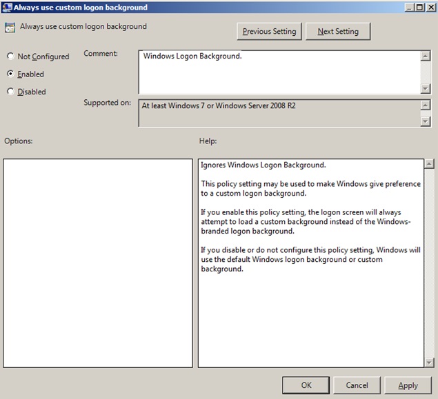 Aquí verás para seleccionar “Always use custom logon background” lo habilitas “Enabled” o "Habilitar".
