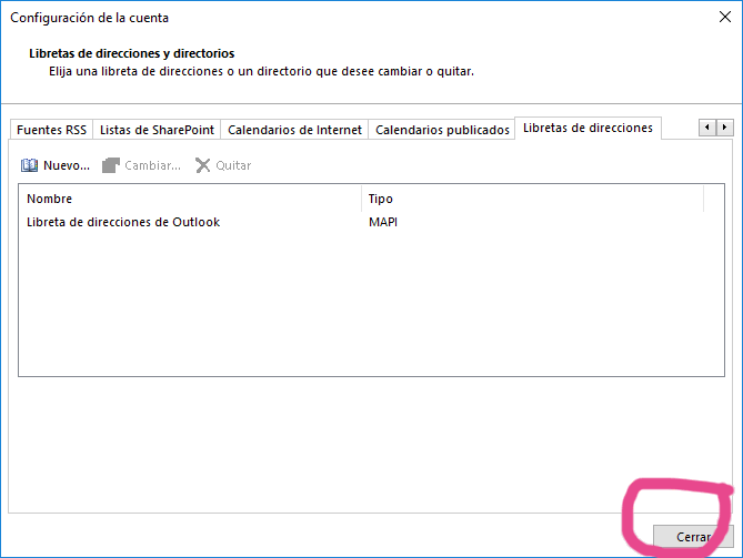 - Si te aparece la casilla de libreta de contactos Outlook, selecciona “Cerrar”.