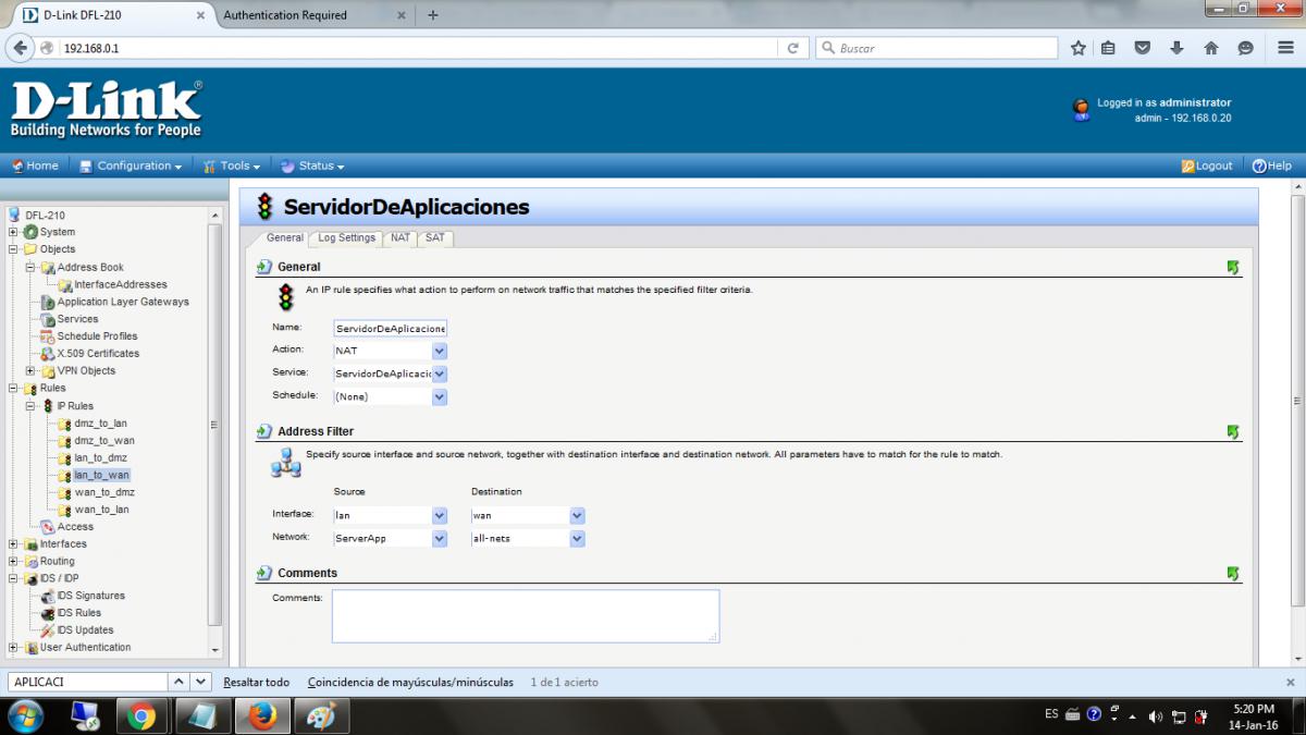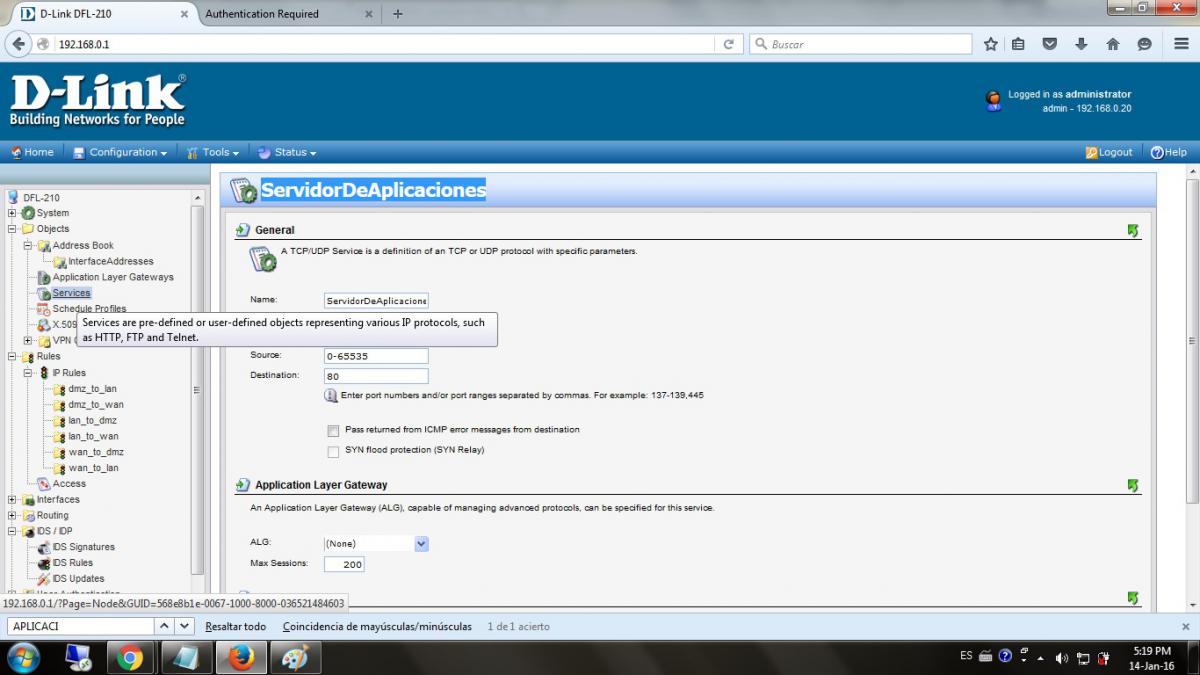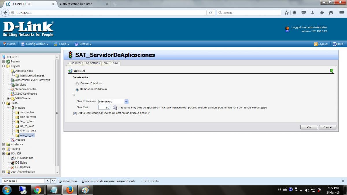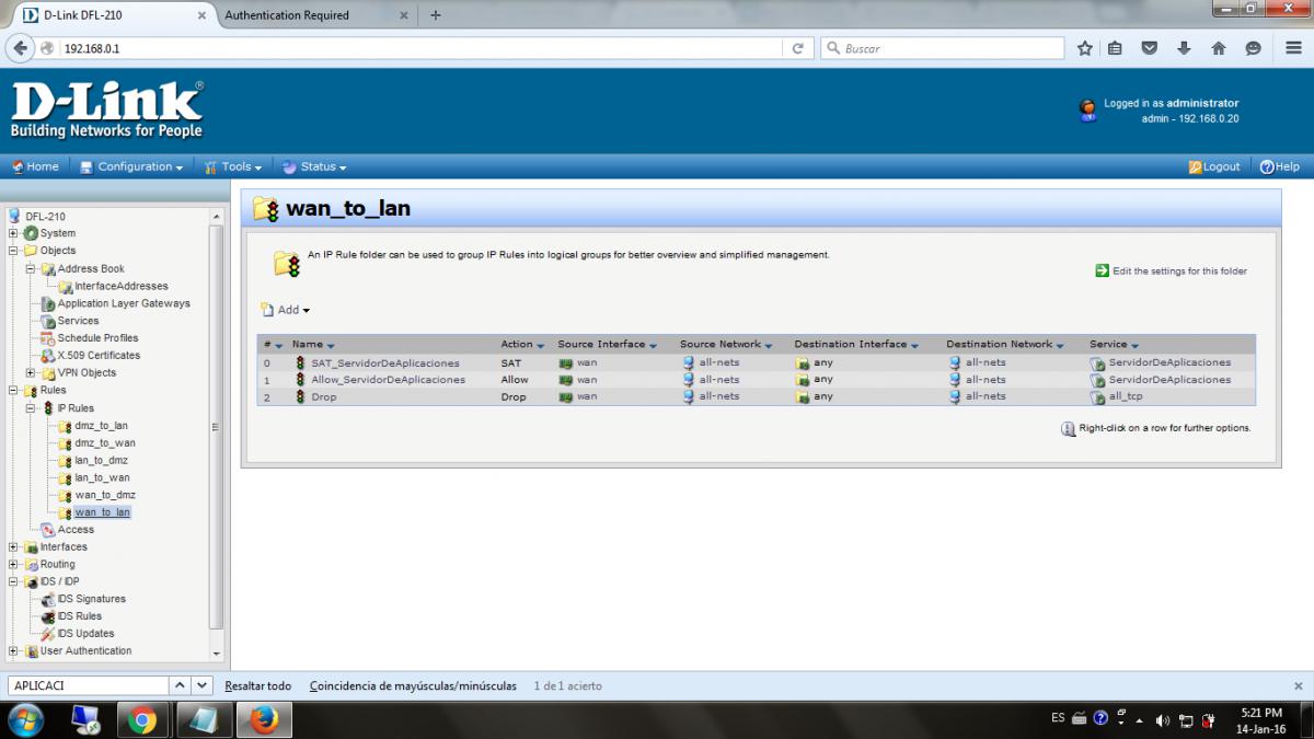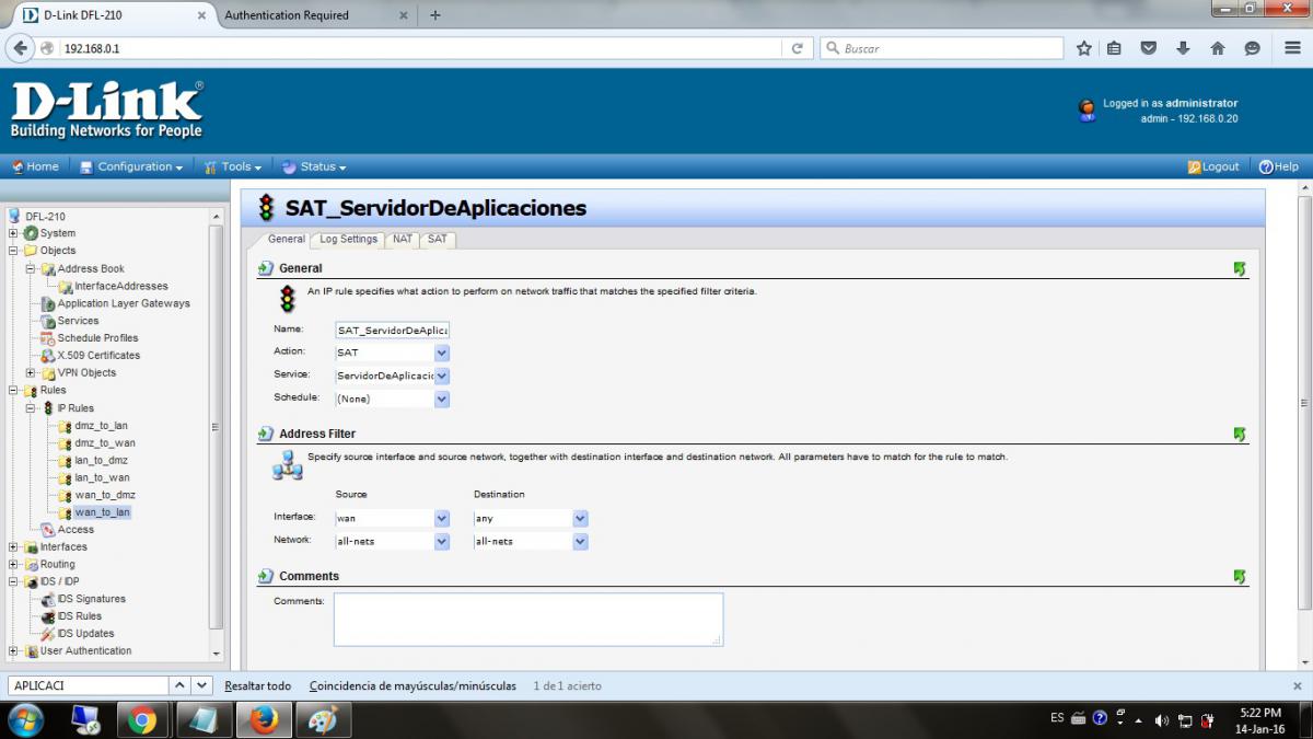 Buen dia estoy usando el firewall d link dfl 210 , quisiera saber como crear una regla de entrada a un servidor de aplicaciones web, trabajo en desarrollo de aplicaciones, y tengo ip publica la cual debe ingresar a un servidor de aplicaciones, el servidor de aplicaciones tienen unos paths, unas rutas, ejemplo, 192.168.0.54/nombreaplicacionRuta1, 192.168.0.54/nombreaplicacion2Ruta1, cabe resaltar que se pueden publicar n aplicaicones en el servidor, lo cual da varias rutas. quisiera saber como crear esta regla wan _ to lan espero que me puedan colaborar. no se mucho de redes, espero la colaboracion compañeros