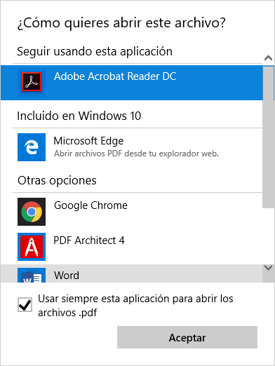 - Lo seleccionas y marcas la casilla: "Usar siempre esta aplicación para abrir los archivos .pdf"