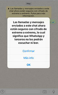Te explico, en principio si tanto emisor como receptor tienen la versión en la que aparece esta función, la conversación quedará cifrada de manera automática. En el caso que quieras comprobar al 100% que esto es así, es cuando tienes que realizar la confirmación. Para ello pulsas sobre el mensaje amarillo y te aparecerá este mensaje: