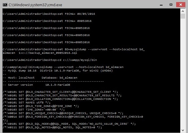 set FECHA= %date% set FECHA=%FECHA:/=% set FECHA=%FECHA: =% set FECHA=%FECHA::=% set FECHA=%FECHA:,=% set BD= c:backup_almacen_%FECHA%.sql cd c://xampp/mysql/bin mysqldump bd_almacen -uroot > %BD% pause
