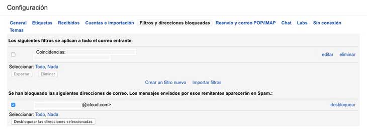 Una vez dentro de la configuración, accede en la parte superior a la pestaña "filtros y direcciones bloqueadas"