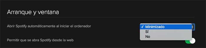 - Dentro del apartado Arranque y ventana, encontrarás la opción Abrir Spotify automáticamente al iniciar el ordenador. Despliega la ventana y pulsa No. Ahora Spotify no iniciará cuando inicies el ordenador. Hecho!