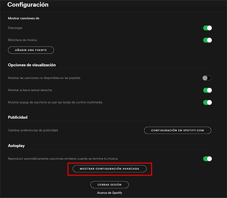 - Aparecerán todas las opciones disponibles y debajo Mostrar configuración avanzada. Pulsa en esta opción para acceder a más opciones de configuración.