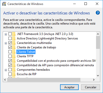Paso 5: Para finalizar debes marcar el recuadro que aparece al lado izquierdo de Cliente Telnet y pulsas en “Aceptar”