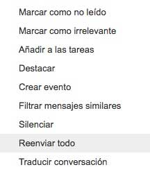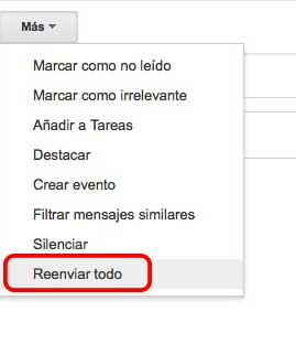 - Selecciona la conversación, y luego dirígete a la parte superior de la pantalla donde se visualiza la palabra “mas” al hacer clic en ella se te muestra un menú con varias alternativas entre las cuales debes escoger “reenviar todo”.