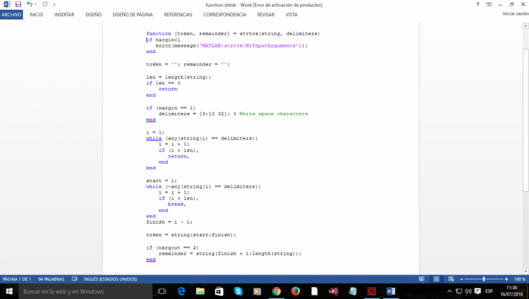 token = strtok ('str') utiliza los delimitadores por defecto, los caracteres de espacio en blanco. Estos incluyen pestañas (ASCII 9), retornos de carro (ASCII 13) y espacios (ASCII 32). Caracteres de espacio en blanco se ignoran. Si str es un conjunto de arrays string, token es un conjunto de arrays token.