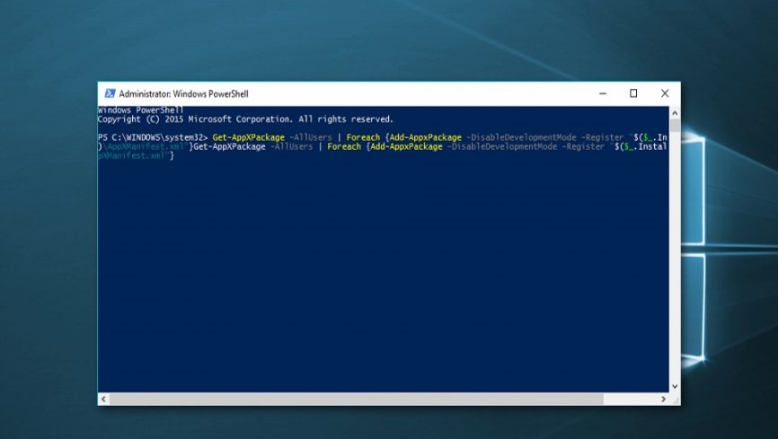 1. Debes ingresar este comando: Get-AppxPackage -AllUsers | Foreach {Add-AppxPackage -DisableDevelopmentMode -Register “$ ($ _ installLocation.) \AppXManifest.xml”}.