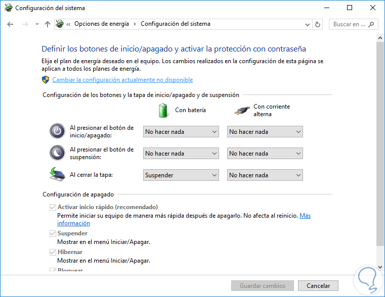 Cómo veréis el inicio rápido es una combinación de hibernación y un apagado completo. Para que se apague realmente y de forma completa sin que se guarde nada, tienes que deshabilitar el inicio rápido en Windows 10.