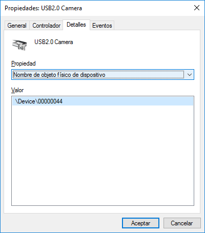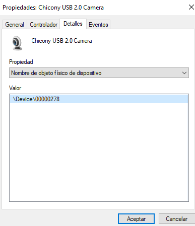 Ahora selecciona aquí la opción: "Nombre de dispositivo fisico del dispositivo" y copia el dato con la ruta que aparece. En mi caso es: