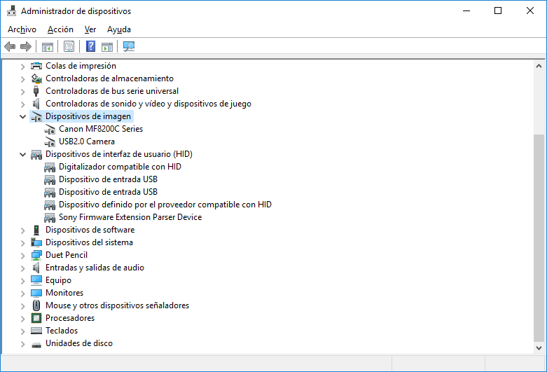 Entra en dispositivos de imagen y ahí debe aparecer tu cámara web (esto ya depende de cada equipo). En mi caso es una cámara USB 2.0 por eso aparece así: