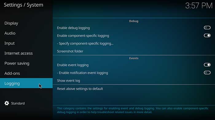 Para configurar los parámetros de los eventos en KODI vamos a System settings y elegimos la línea Logging: