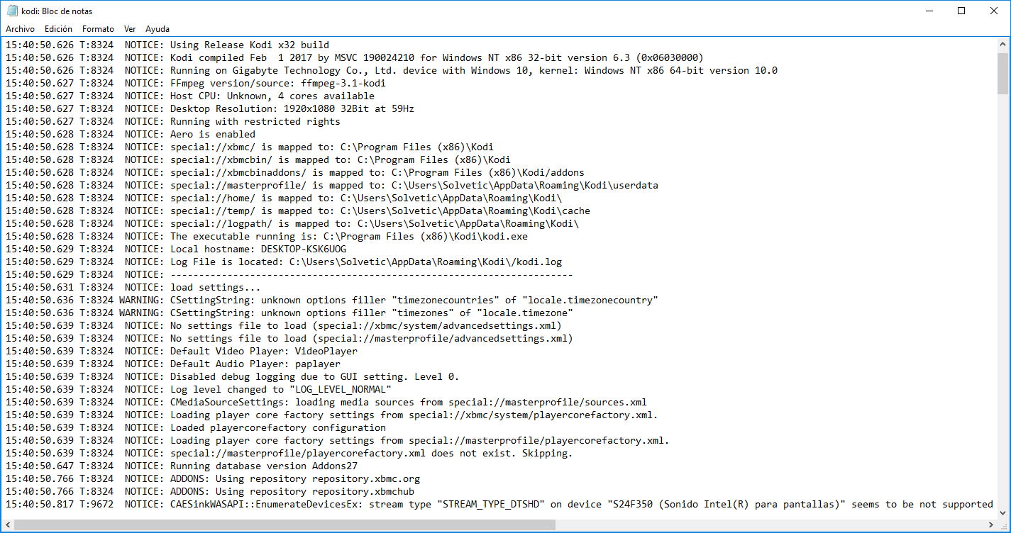Allí abrimos el archivo .txt llamado Kodi y podremos ver todos los eventos en tiempo real:
