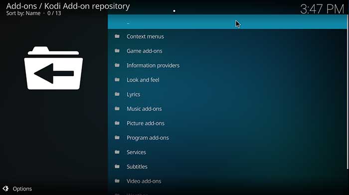 4. Se desplegará la siguiente ventana. Seleccionamos la opción Kodi Add-on repository y este será el resultado: