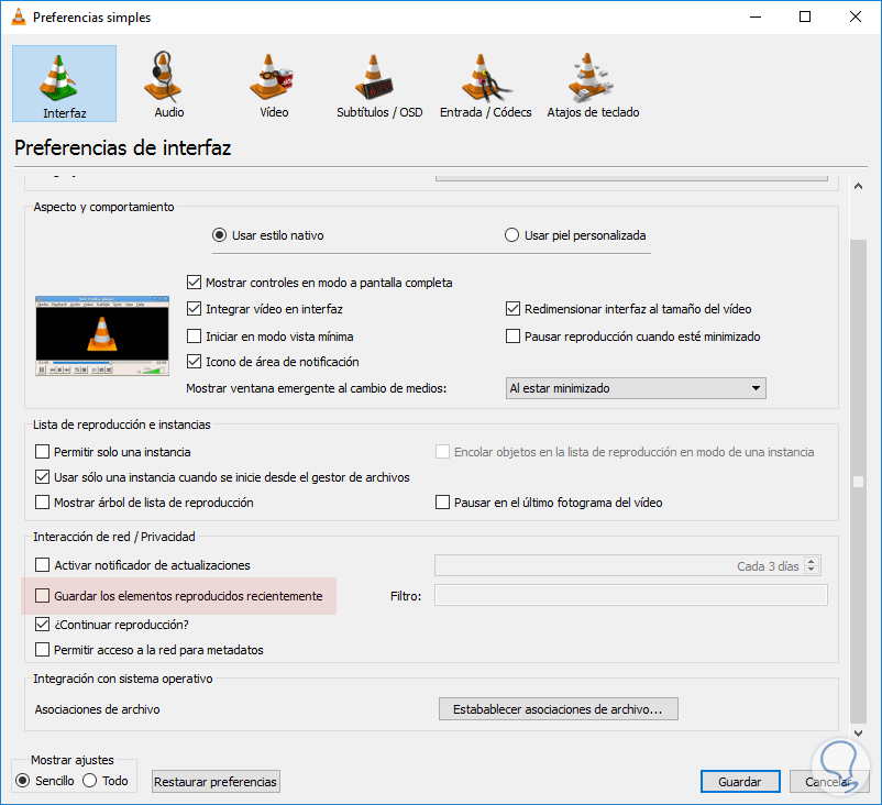 - Ya en preferencias, busca la característica de “Interfaz”, una vez en ella, podrás ver varias opciones marcadas como activadas, deberás desmarcar (desactivar) la siguiente: “Guardar los elementos que se han reproducido recientemente”.