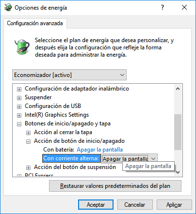 Hola a todos, me gustaría preguntaros si es posible hacer que en mi ordenador portátil que tiene Windows 10, es posible hacer que al pulsar un toque al botón de encender o apagar ordenador (Botón Power ON/OFF) se apague solo la pantalla del equipo??? es que ahora al pulsarlo se apaga el equipo o se va a la suspensión y la verdad que no me gusta.