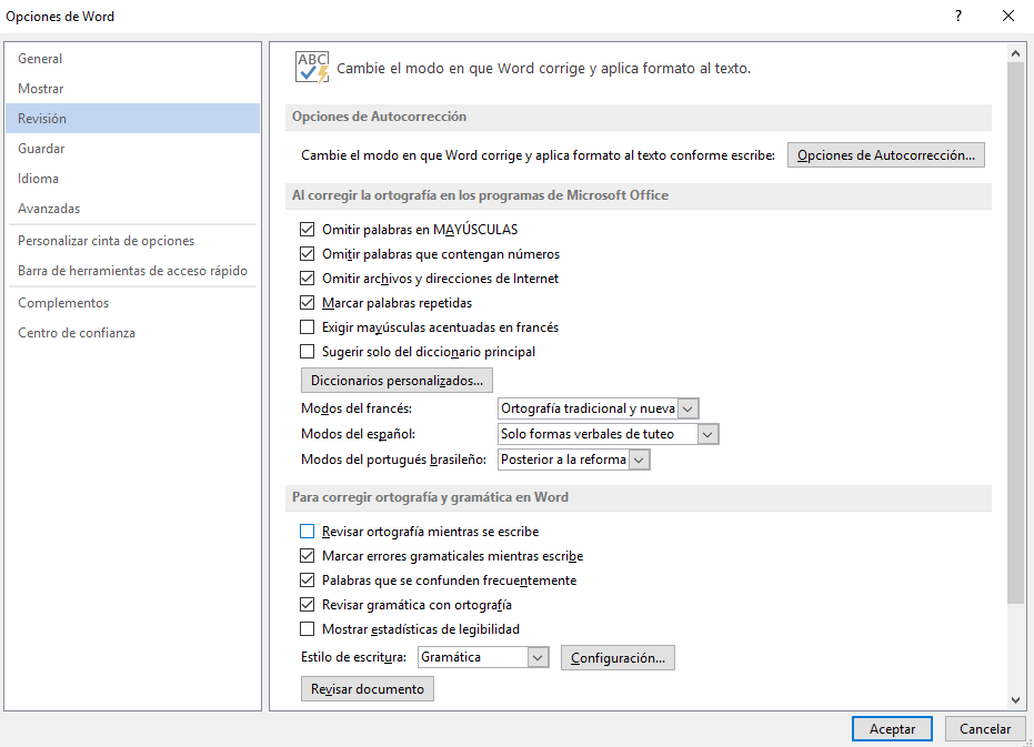 - Desmarca la opción Revisar ortografía mientras se escribe