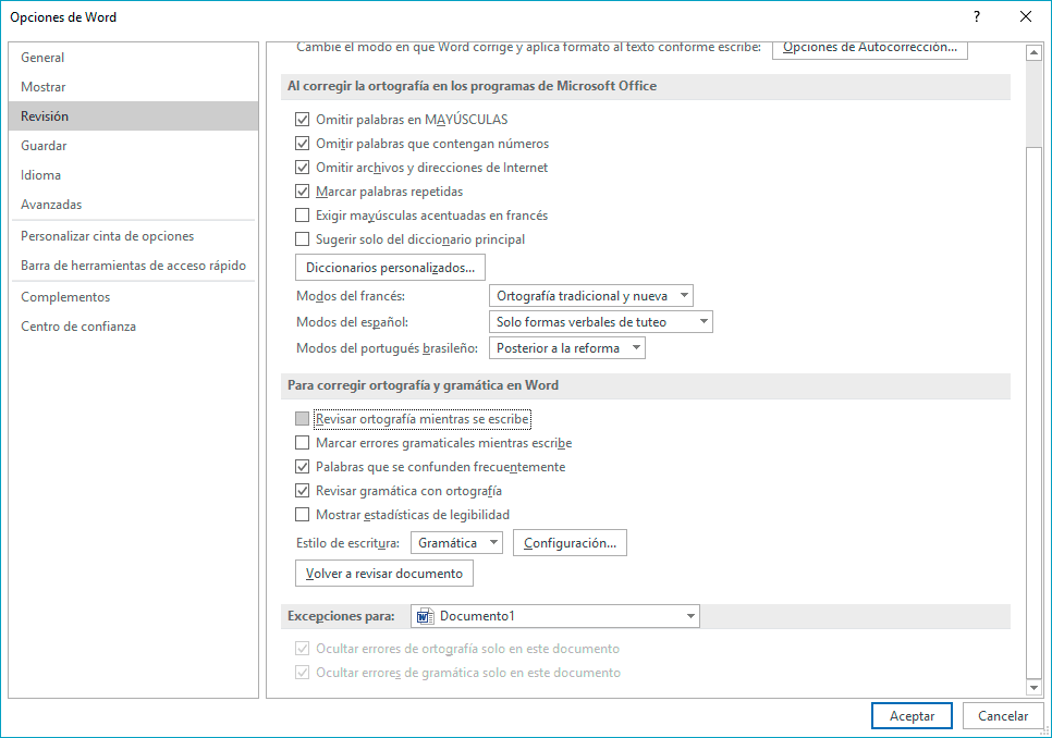 2) Deshabilitar línea roja palabras mal escritas Word 2016
