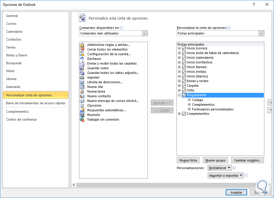 Ahora para acceder a las opciones que sepas que lo tienes en la pestaña "Desarrollador". Si no te aparece esa pestaña Desarrollador la puedes habilitar en la opción "Personalizar cinta de opciones". Ahora en el panel derecho verás que aparece la pestaña "Desarrollador", marcala y Aceptas.