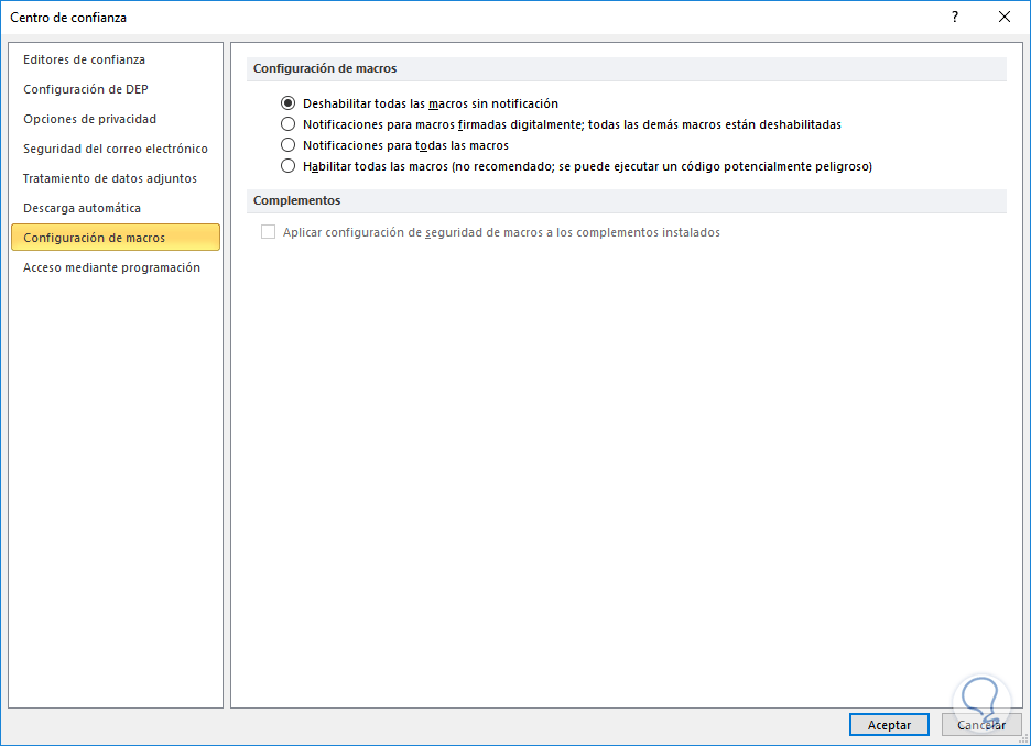 - Notificaciones para macros firmadas digitalmente, todas las demás macros están deshabilitadas