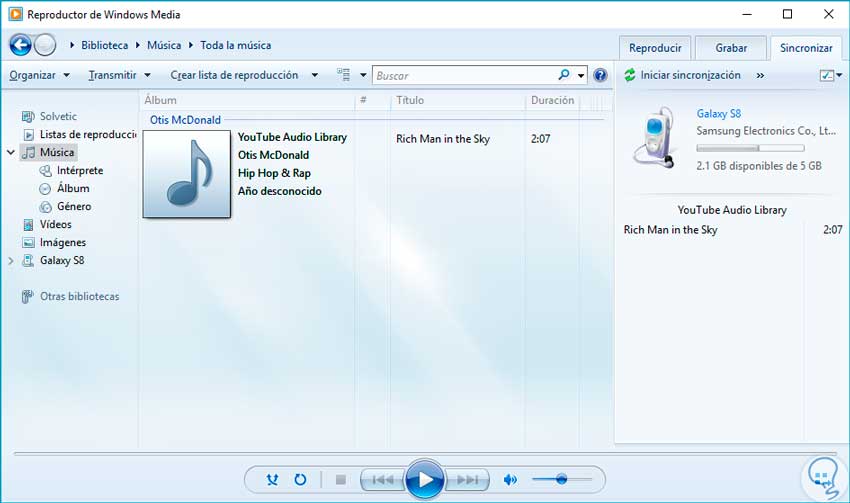 Abre el reproductor y en la parte derecha pulsa en la pestaña de Sincronizar. Verás que se encuentra tu teléfono Galaxy S8.