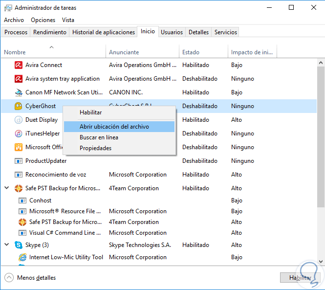 - Aquí veremos la lista de programas que se activan al iniciar nuestro PC. Realizamos clic derecho encima del programa y seleccionamos “Abrir ubicación del archivo”.
