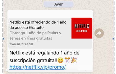 En este tipo de phishing con esta oferta falsa que os está ofreciendo un año de servicio gratis de Netflix lo veréis a través de WhatsApp de algún contacto conocido (si ha caido) y os ponen el enlace que muestras en la imagen. Es una oferta falsa.