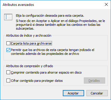 - Desmarca la opción: "Permitir que los archivos de esta carpeta tengan indizado el contenido además de las propiedades de archivo". (Prueba con ello desmarcado y si sigue igual prueba con ello marcado para la indizacion).