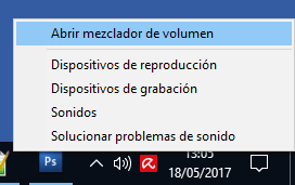 - Abres el mezclador de volumen. (Botón derecho en el icono de volúmen en la parte derecha de la barra de tareas o también para abrirlo puedes pulsar tecla Windows + R y escribir y aceptar escribiendo: sndvol).