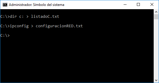 Por ejemplo para guardar la salida del comando DIR que es para ver el listado de directorios. Si quieres guardarte ese listado en un archivo de texto en vez de verlo en plan rápido porque es un listado muy largo o porque lo quieres enviar por correo o guardarlo, este comando sería tu amigo.