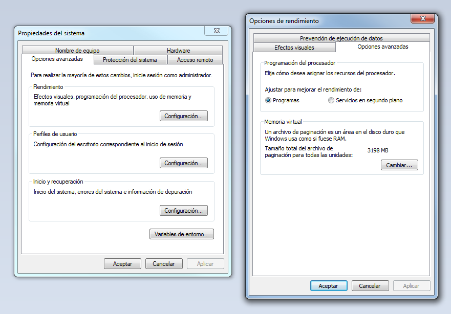 B) Cuando ya te encuentres en esa ventana nueva vas a realizar un clic sobre la opción de “Configuración del apartado de rendimiento” y de nuevo vas a ingresar en la pestaña de opciones avanzadas, pero ahora te vas a dirigir a la parte del apartado de “Memoria Virtual” en donde vas a poder configurar todo de manera manual de acuerdo al sistema de tu PC.