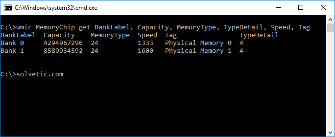 C:\>wmic MemoryChip get BankLabel, Capacity, MemoryType, TypeDetail, Speed, Tag