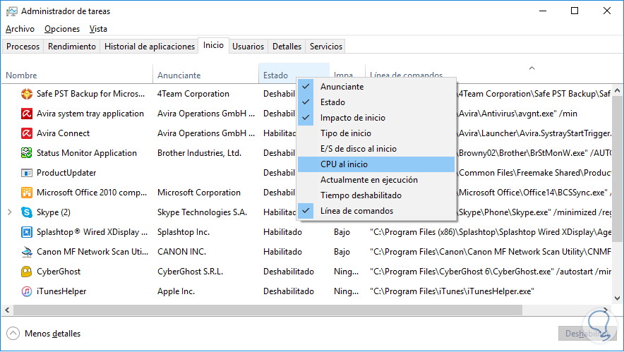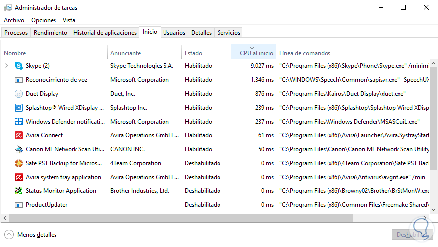 - Verás que aparece ahora una pestaña llamada "CPU al inicio" donde se ve de forma clara el tiempo de ejecución que lleva cada programa o proceso. Pulsando arriba en esa pestaña lo organizas como ves en la imagen que aparece ahora por orden de los que más tiempo hayan y sigan consumiendo.