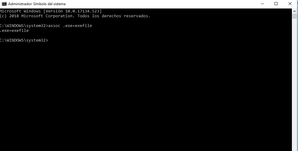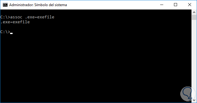- Ahora, deberás escribir los comandos: assoc .exe=exefile