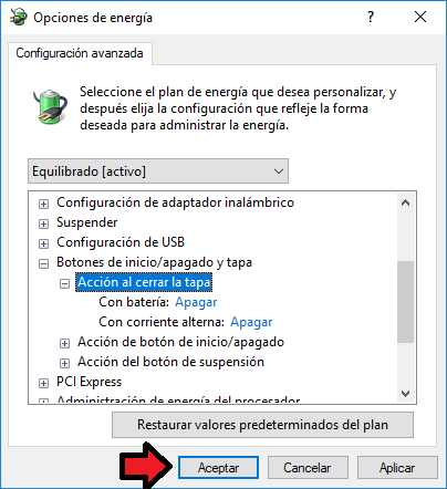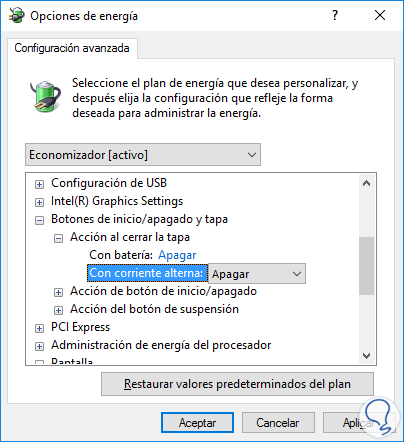 En este momento vas a poder escoger todo comportamiento que mejor te convenga para el momento de cerrar la tapa de la PC.