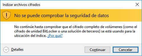 Puedes personalizar la indexación. Solo tienes que habilitar esta opción donde se reconstruirá el índice de indexación y búsqueda. Aparecerán advertencias de seguridad cuando termines, lo aceptas y continuas.