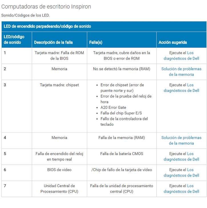 aquí vengo a ayudarte jeje. A ver, Dell otra cosa no, pero le gusta indicarte el error con luces LED y sonidos dependiendo del modelo del equipo. Tiene buenos diagnósticos. Aquí tienes unos codigos sobre como funcionan y que son cada cosa: