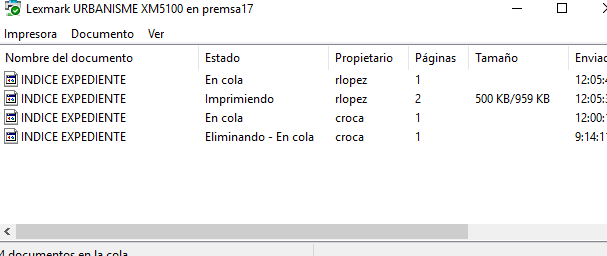 Despues he iniciado sesion con mi usuario en el PC que va mal y si anteriormente habia intentado imprimir con el otro usuario afectado y se habian quedado los archivos en cola NO ME DEJA IMPRIMIR, si la cola esta limpia SI QUE ME DEJA (adjunto foto).