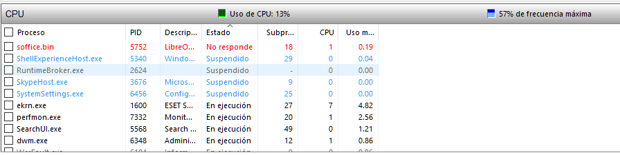 Al intentar imprimir. Con el administrador de tareas he ido a rendimiento y he abierto el monitor de recursos de ethernet, me ha salido que el proceso soffice.bin no responde, tengo varias capturas de esto con el problema en el mismo proceso, pero con diferente PID nose si es normal yo pensaba que cada proceso siempre usaba el mismo PID,que entiendo es el puerto.