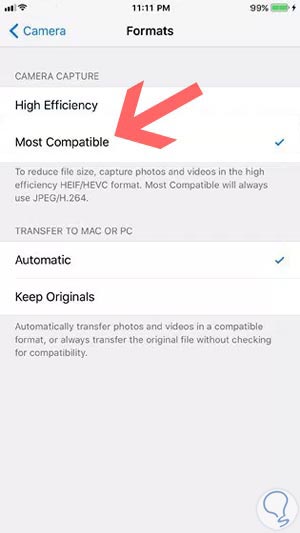 "Para reducir el tamaño de archivos, toma fotos y vídeos en Formato Alta eficiencia HEIF/HEVC. Máximo compatible (Most compatible siempre usará JPEG/H.264)".