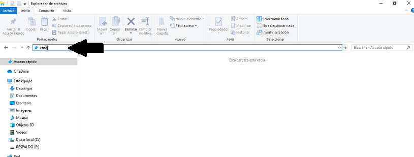 - Debes abrir una carpeta, o en caso de que ya te encuentres en una, debes escribir “cmd” en la barra de direcciones y luego presionar “Enter”.