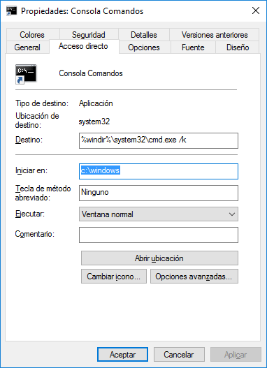 Carpeta estándar: “%windir%\system32\cmd.exe /k”