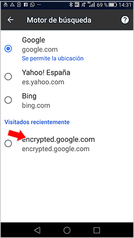 -Pulsa en motor de búsqueda en la primera opción. Te despegará varias opciones para elegir. Elige Encrypted.google. com y se abrirá de forma predeterminada para hacer todas tus búsquedas.