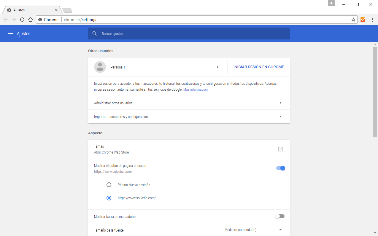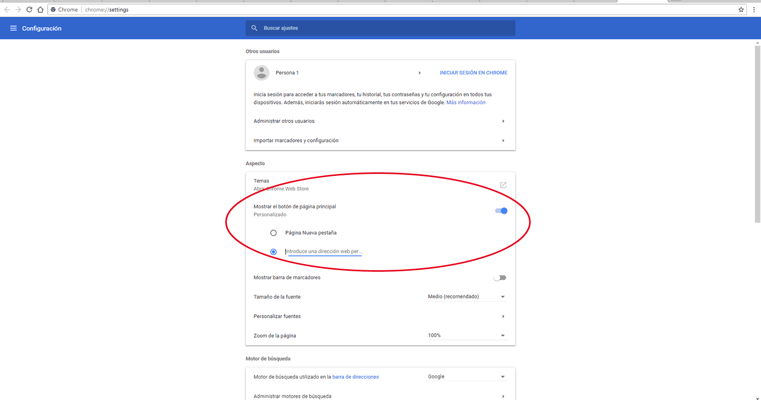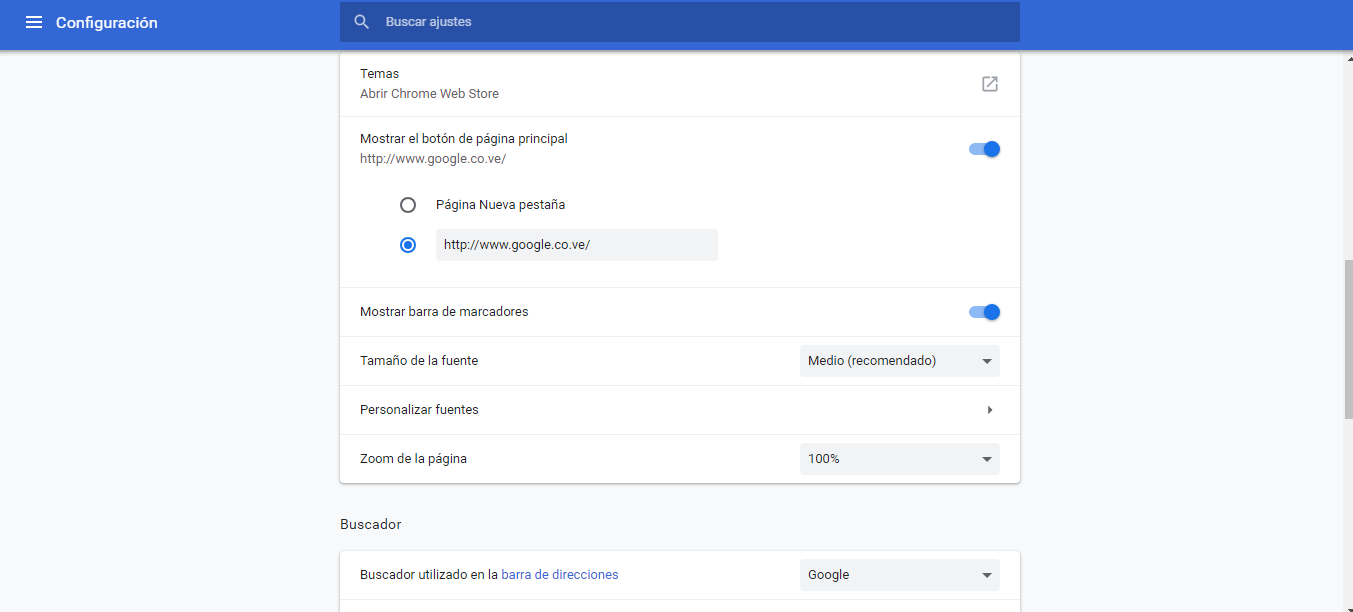 2. Aparecerás dentro de los ajustes de confifguración de Chrome. Dentro de "Aspecto" desliza la pestaña "Mostrar el botón de página actual!" Podrás establecer página de nueva pestaña o agregar una página.
