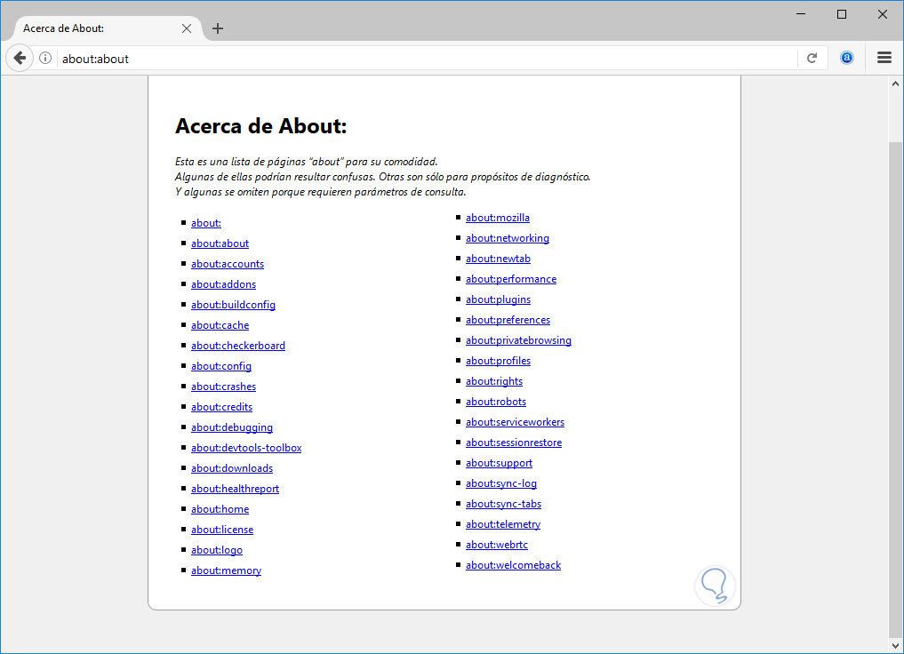 Como ves en la imagen, este comandos te muestra la lista de todos los comandos about: soportados por esa versión específica de Firefox que estés ejecutando. Es la que más te recomiendo para revisar todos.