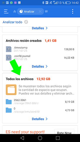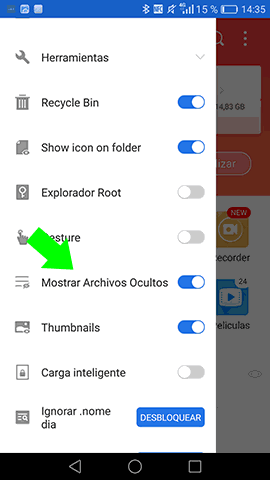 2- Entra en ES File Explorery en el lado izquierdo de la App configura la pestaña “ver archivos ocultos”. Esto lo haremos porque la carpeta de Estado suele estaroculta pero si procedemos con esto dejará de estarlo.