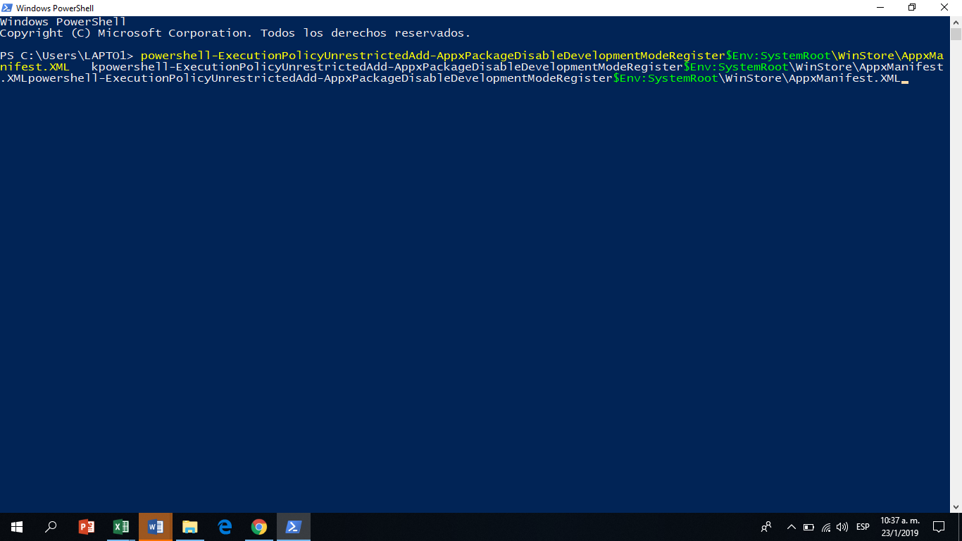 - Vas a pegar este texto: “powershell-ExecutionPolicyUnrestrictedAdd-AppxPackageDisableDevelopmentModeRegister$Env:SystemRoot\WinStore\AppxManifest.XML”.