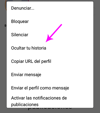 Otra de las opciones que tienes, es hacerlo a través del perfil de la persona. Para ello entra en su cuenta y seleccionando el menú desplegable, vas a encontrar una opción que pone "Ocultar historia" tienes que seleccionar esto y confirmar la acción.