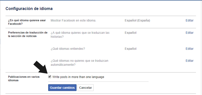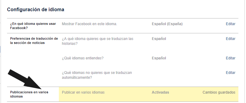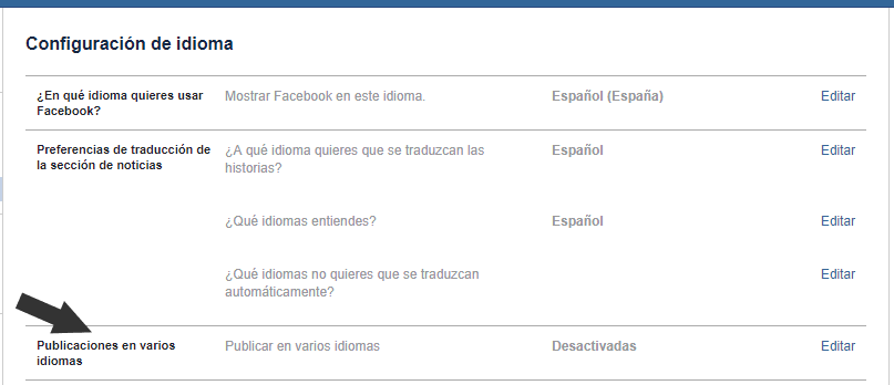 TERCERO: Aquí encontrarás en tercer lugar la opción Publicaciones en varios idiomas que por defecto está desactivada en Facebook. Pulsa editar y podrás configurar dicha opción.